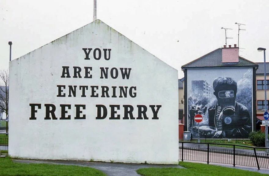 As we drove on the sailor told me we were going to be entering Free Derry. He explained that the term was coined in January, 1969, after a nasty incursion into Catholic neighborhoods by the near totally Protestant Royal Ulster Constabulary (RUC). Afterwards barricades were set up in the major Catholic areas of the city and the RUC was not permitted to enter. The British Army took over and the relationship went well for quite a while and the barricades came down. Internment changed everything however. Catholic residents of the Bogside neighbourhood declared their part of the city was now a “No Go” area for the RUC and the British Army. Burned out cars were used to block entrances to the area and armed men manned the barricades to control who was let in.